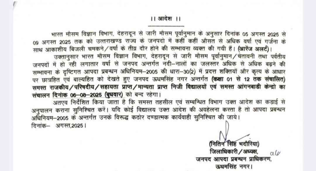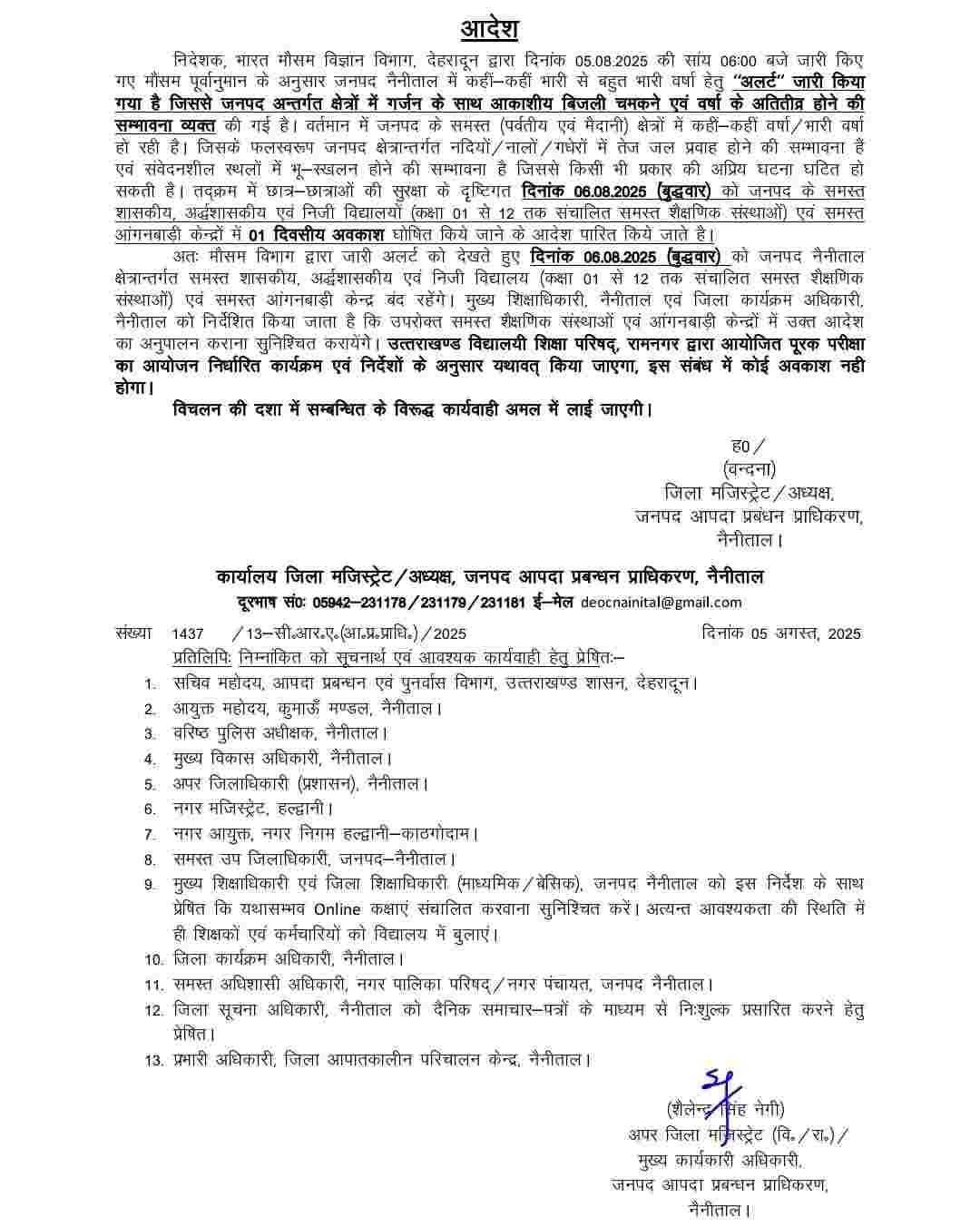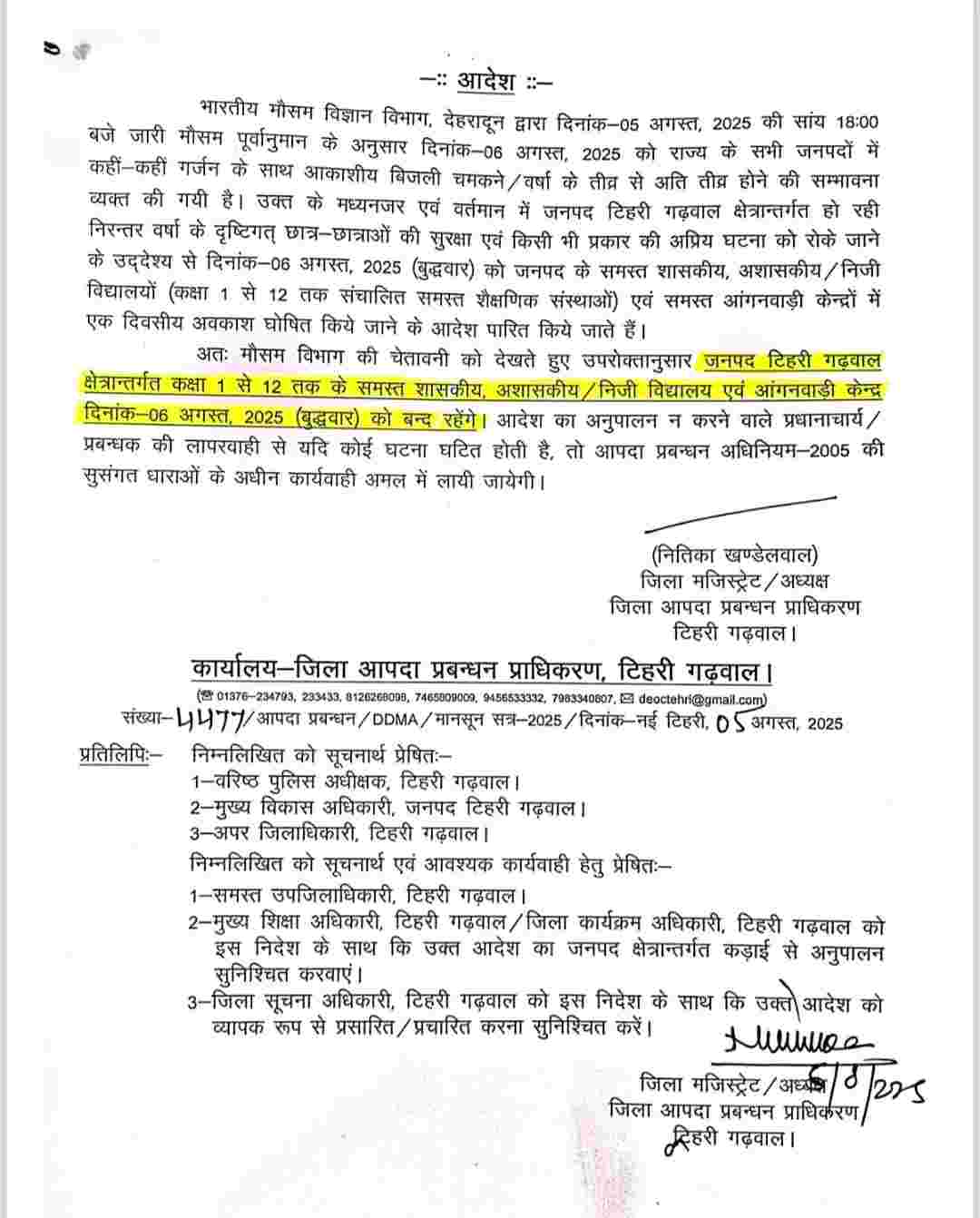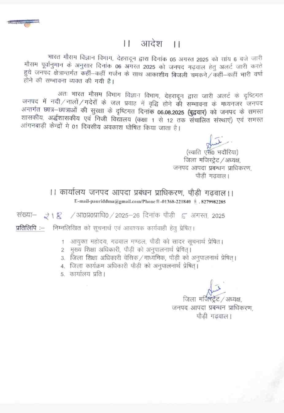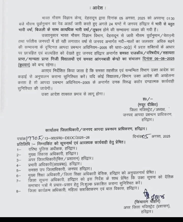 Uttarkashi dehradun nainital pauri garhwal champawat udham Singh Nagar chamoli Tehri Garhwal Rudraprayag almora haridwar Pithoragarh school closed tomorrow heavy rain alert holiday today: देहरादून सहित रूद्रप्रयाग, टिहरी गढ़वाल, पौड़ी गढ़वाल, नैनीताल, उत्तरकाशी , हरिद्वार, पिथौरागढ़, चमोली, उधम सिंह नगर और, चम्पावत अल्मोड़ा जिलों में आज बुधवार 6 अगस्त को भी बंद रहेंगे सभी स्कूल आंगनबाड़ी केंद्र, आदेश जारी…