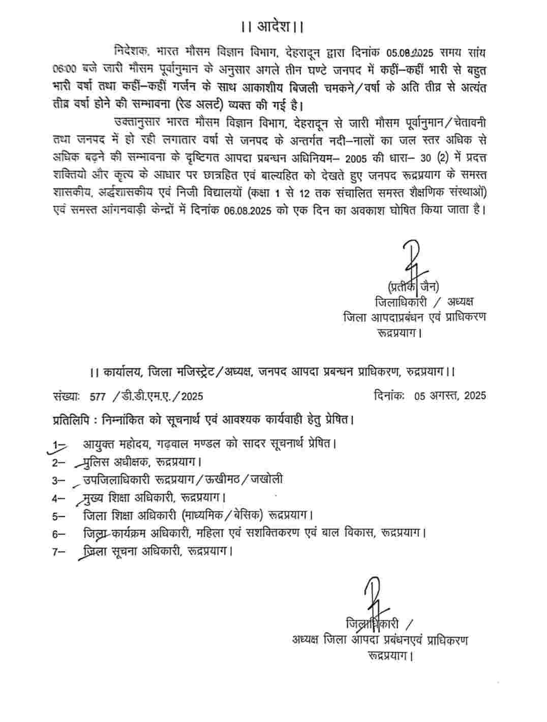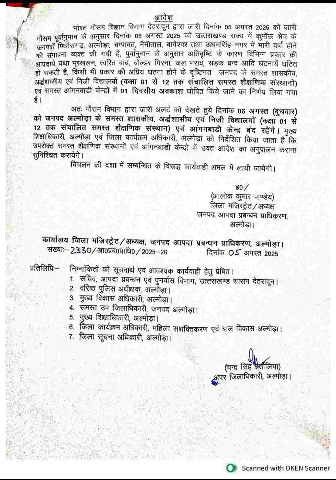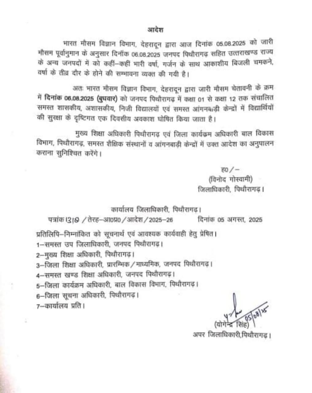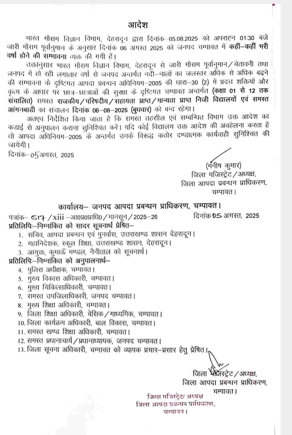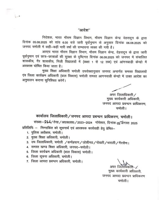 Uttarkashi dehradun nainital pauri garhwal champawat udham Singh Nagar chamoli Tehri Garhwal Rudraprayag almora haridwar Pithoragarh school closed tomorrow heavy rain alert holiday today: देहरादून सहित रूद्रप्रयाग, टिहरी गढ़वाल, पौड़ी गढ़वाल, नैनीताल, उत्तरकाशी , हरिद्वार, पिथौरागढ़, चमोली, उधम सिंह नगर और, चम्पावत अल्मोड़ा जिलों में आज बुधवार 6 अगस्त को भी बंद रहेंगे सभी स्कूल आंगनबाड़ी केंद्र, आदेश जारी…
