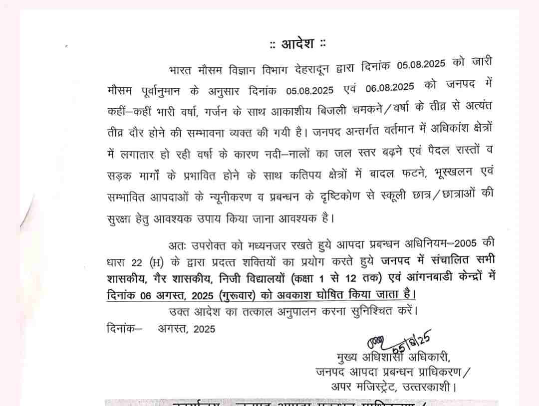 Uttarakhand school closed tomorrow heavy rain alert holiday today: उत्तराखण्ड में बीते शनिवार रात से मौसम का कहर जारी है। जिसे देखते हुए जहां शासन प्रशासन अलर्ट मोड पर आ गया है वहीं मंगलवार दोपहर को उत्तरकाशी के हरसिल धराली में हुई जल प्रलय से समूचे देश प्रदेश में हड़कंप मचा हुआ है। इसी बीच इस वक्त की सबसे बड़ी खबर स्कूलों एवं आंगनबाड़ी केंद्रों के संबंध में सामने आ रही है। बताया गया है कि उत्तरकाशी जिले में हुई बादल फटने अतिवृष्टि की घटना को देखते हुए उत्तरकाशी के अपर जिला मजिस्ट्रेट ने बुधवार 6 अगस्त को जिले के सभी विद्यालयों एवं आंगनबाड़ी केंद्रों में एक दिवसीय अवकाश घोषित कर दिया है। इसके साथ ही पिथौरागढ़, देहरादून पौड़ी गढ़वाल, चमोली, चम्पावत, नैनीताल, उधम सिंह नगर, अल्मोड़ा, रूद्रप्रयाग, टिहरी गढ़वाल और हरिद्वार जिला प्रशासन ने भी बुधवार 6 अगस्त को स्कूलों आंगनबाड़ी केंद्रों में एक दिवसीय अवकाश घोषित कर दिया है।