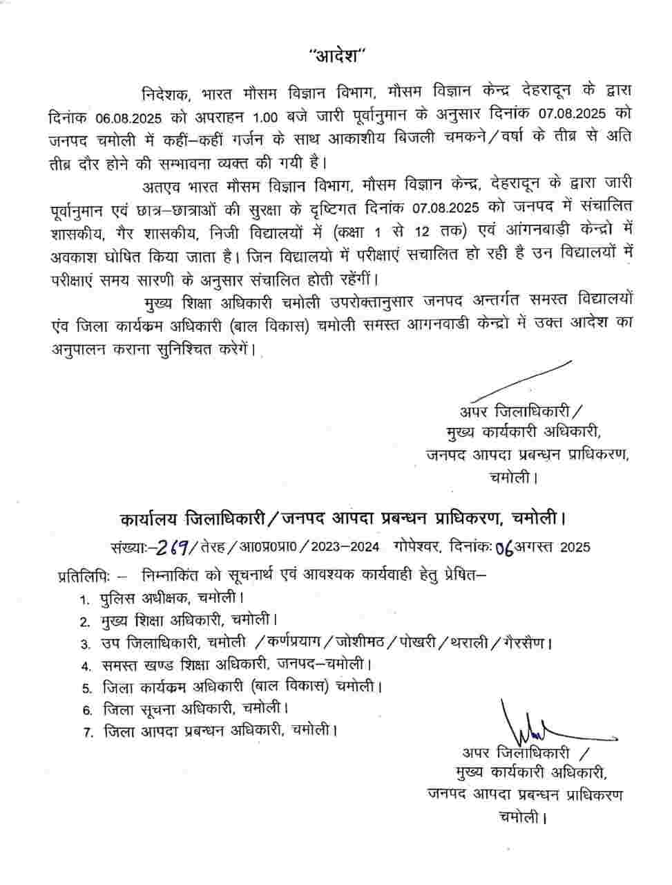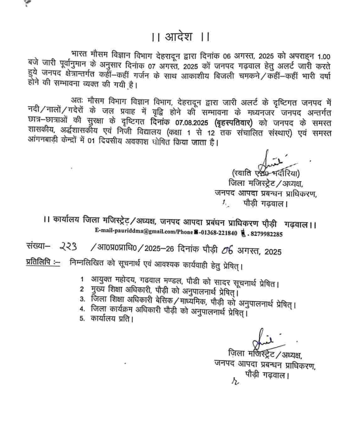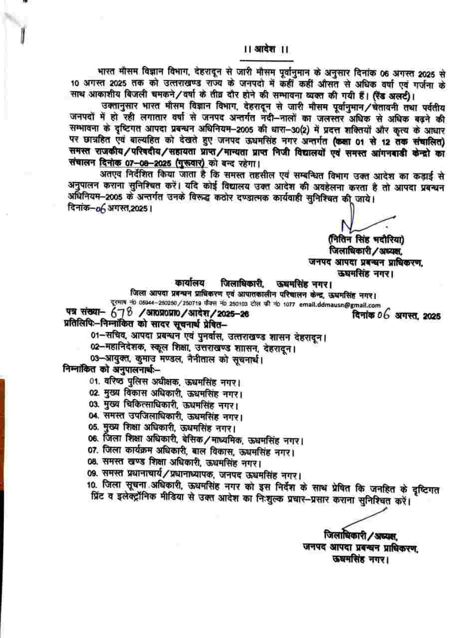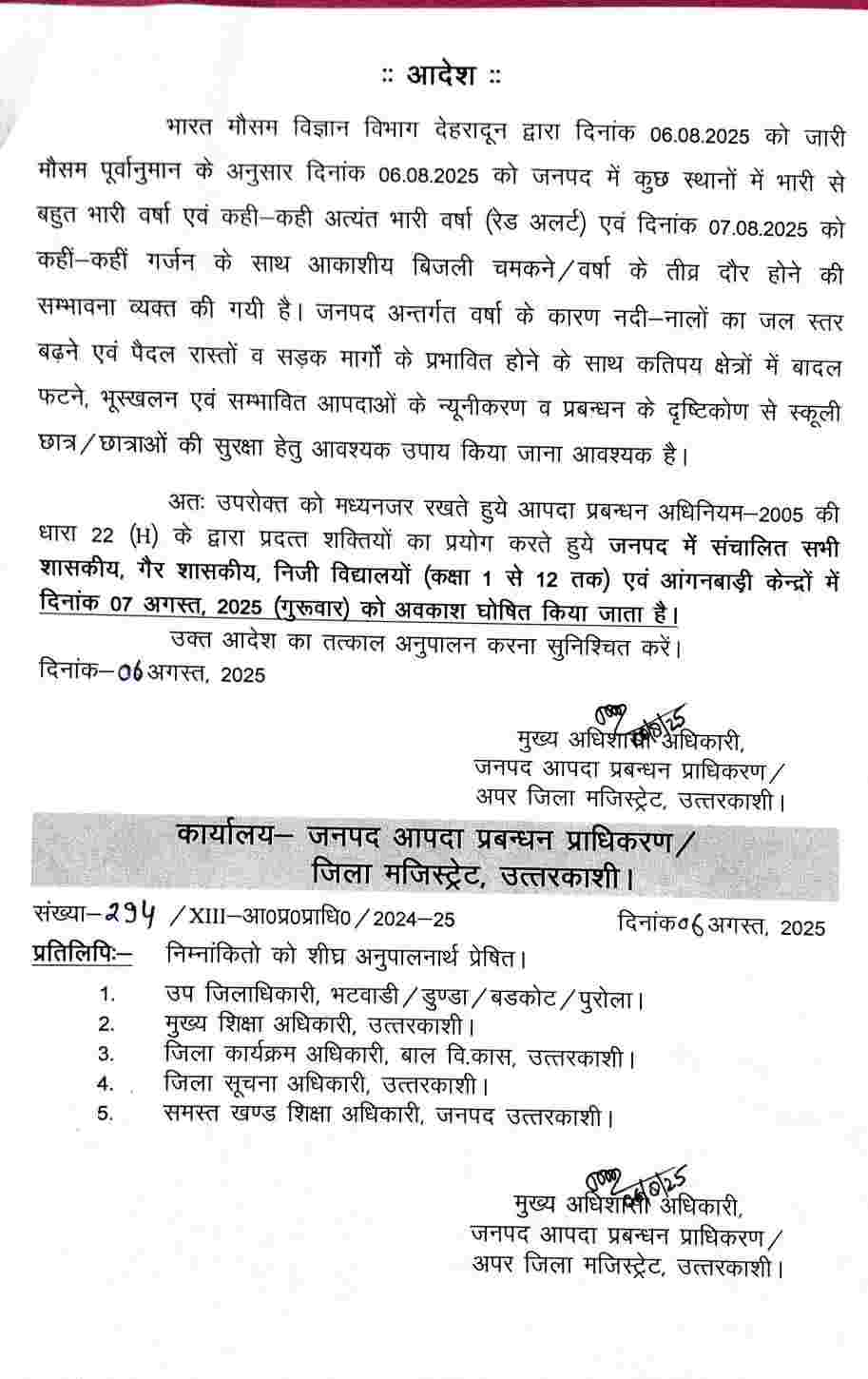 इस संबंध में जिला प्रशासन द्वारा आदेशों में स्पष्ट रूप से बताया गया है कि उत्तरकाशी, उधम सिंह नगर, पौड़ी गढ़वाल और चमोली जिले में संचालित 12वीं कक्षा तक के सभी सरकारी, अर्धसरकारी एवं निजी विद्यालय तथा आंगनबाड़ी केंद्र गुरुवार 7 अगस्त को बंद रहेंगे।