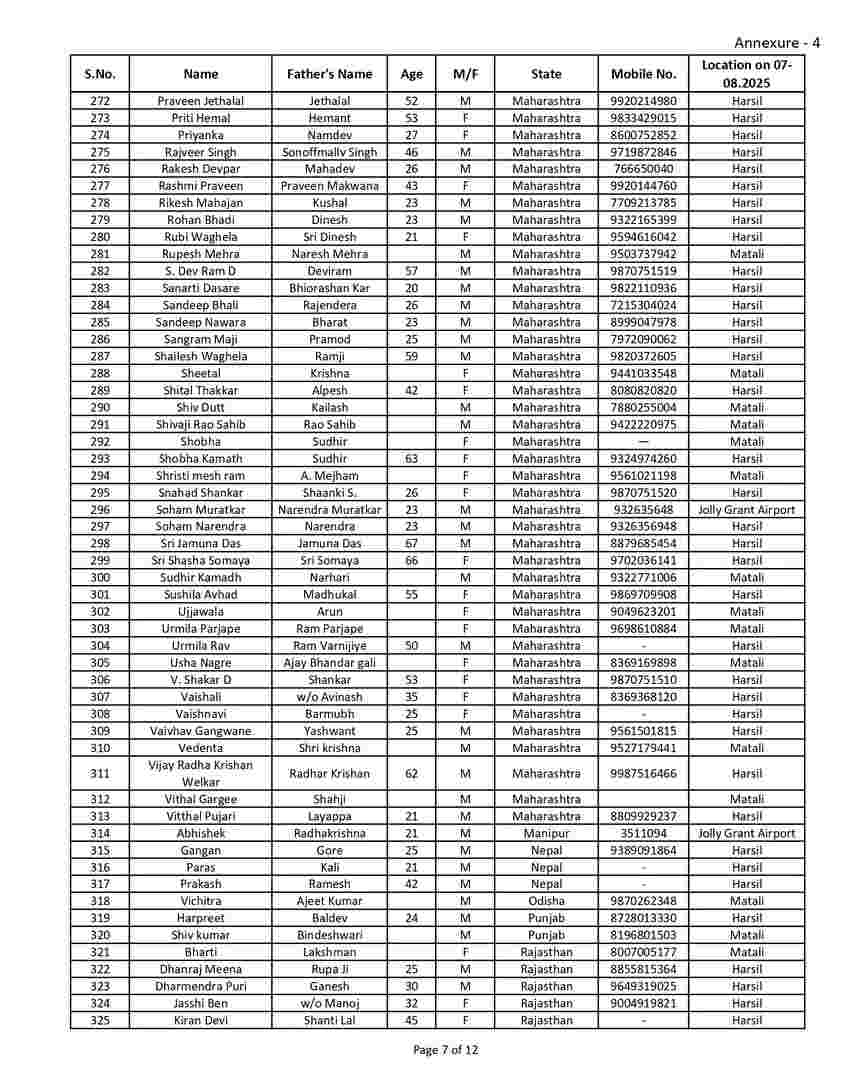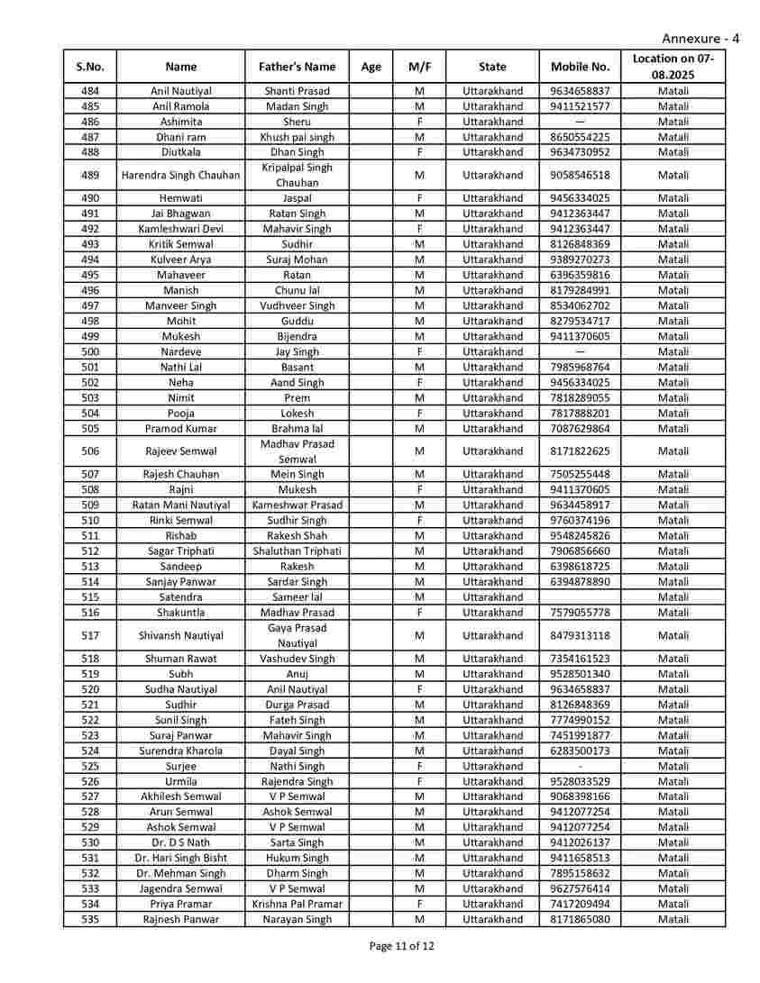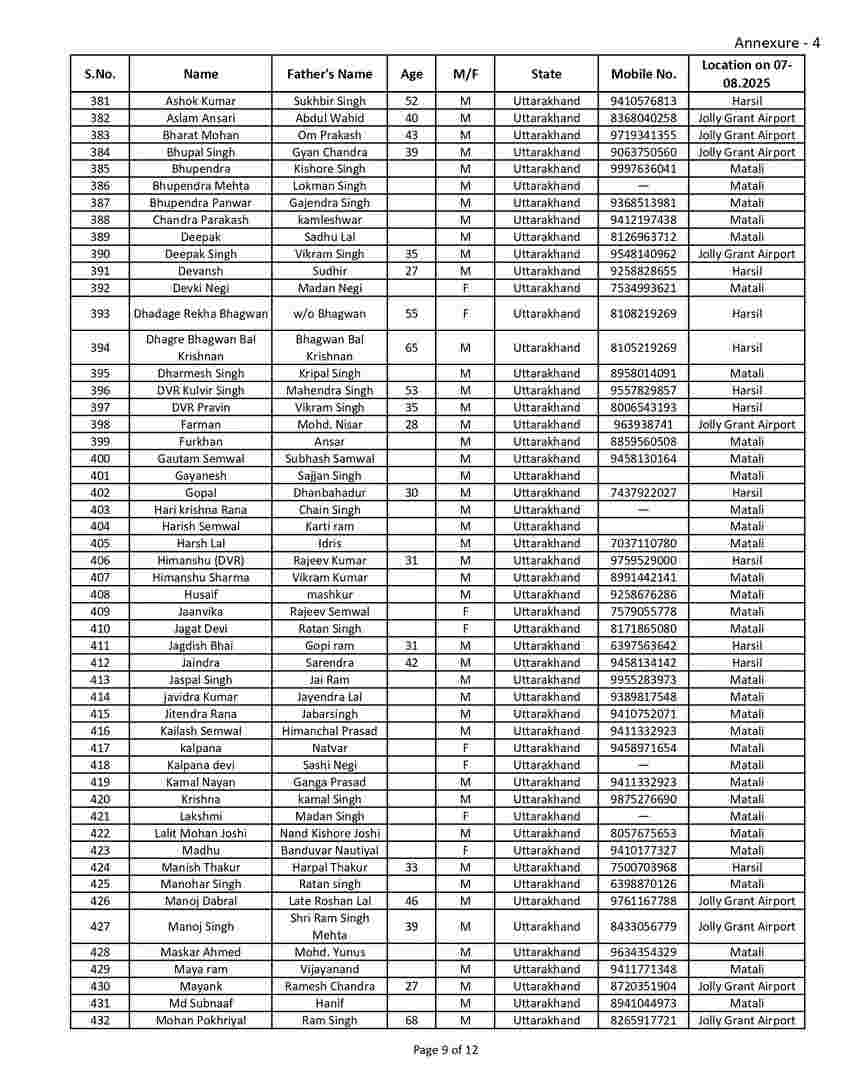 उत्तराखण्ड आपदा प्राधिकरण ने जारी की सूची: राज्य आपदा प्रबंधन प्राधिकरण द्वारा जारी प्रेस विज्ञप्ति में बताया गया है कि दिनांक 07 अगस्त 2025 को हर्षिल क्षेत्र से कुल 550 यात्रियों को सुरक्षित स्थानों पर पहुँचाया गया। इनमें से 260 यात्रियों को मातली, 112 को जौलीग्रांट लाया गया, जबकि शेष यात्रियों को गंगोत्री, भैरवघाटी आदि क्षेत्रों से रेस्क्यू कर सुरक्षित स्थानों पर भेजा गया। प्राधिकरण द्वारा 7 अगस्त को रेस्क्यू किए गए सभी लोगों की सूची जारी कर दी है।