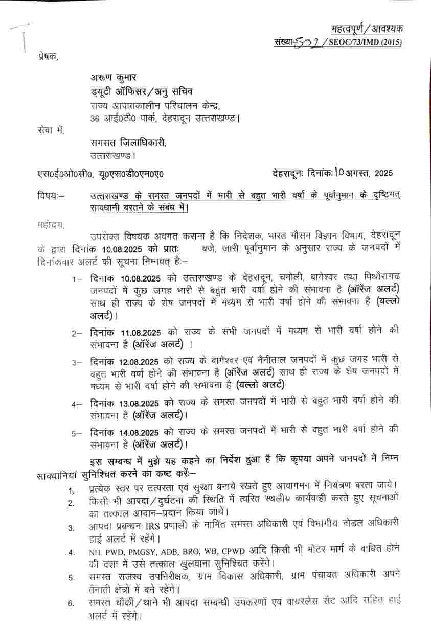 आज रविवार देर शाम जारी इस आदेश में बताया गया है कि मौसम विभाग द्वारा आज जारी ताजा पूर्वानुमान में दिनांक 10.08.2025 को उत्तराखण्ड के देहरादून, चमोली, बागेश्वर तथा पिथौरागढ़ जनपदों में कुछ जगह भारी से बहुत भारी वर्षा होने की संभावना जताते हुए ऑरेंज अलर्ट तथा अन्य सभी जनपदों में मध्यम से भारी वर्षा होने की संभावना व्यक्त करते हुए यलो अलर्ट जारी किया है।