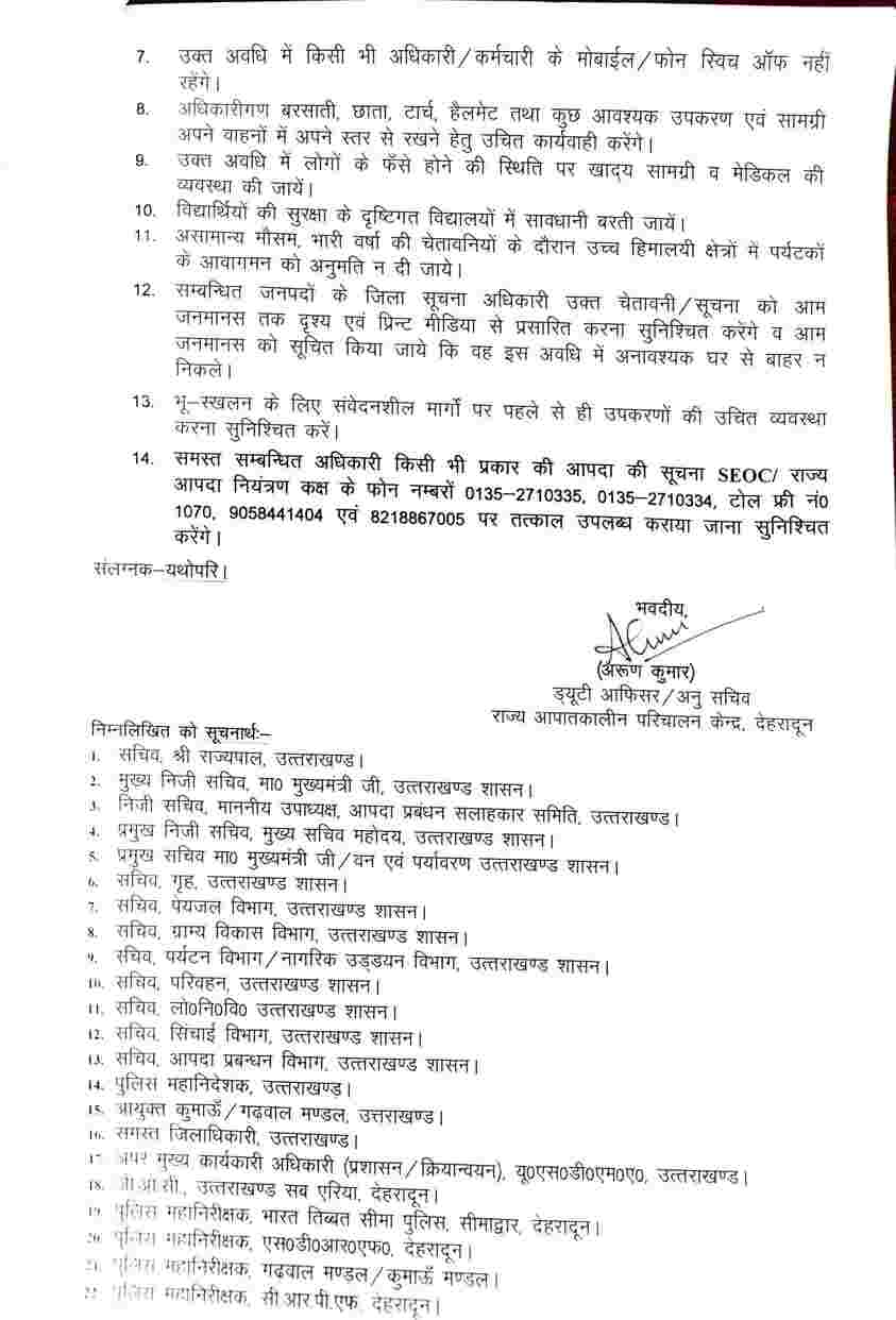 बुधवार 13 अगस्त एवं बृहस्पतिवार 14 अगस्त को राज्य के समस्त जनपदों में भारी से बहुत भारी वर्षा होने की संभावना जताई गई है। जिसको देखते हुए मौसम विभाग ने दोनों दिन समूचे उत्तराखण्ड में ऑरेंज अलर्ट जारी किया है। आपदा परिचालन केंद्र द्वारा सभी जिलाधिकारियों को प्रेषित इस आदेश में 24*7 किसी भी आपातकालीन परिस्थिति हेतु अलर्ट मोड पर रहने तथा जिले के समस्त अधिकारियों को भी अलर्ट रहने तथा 24*7 मोबाइल चालू रखने हेतु निर्देशित करने के आदेश दिए गए हैं।