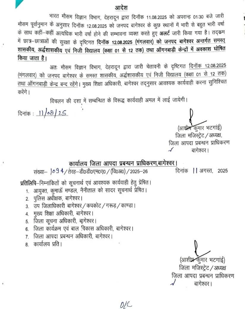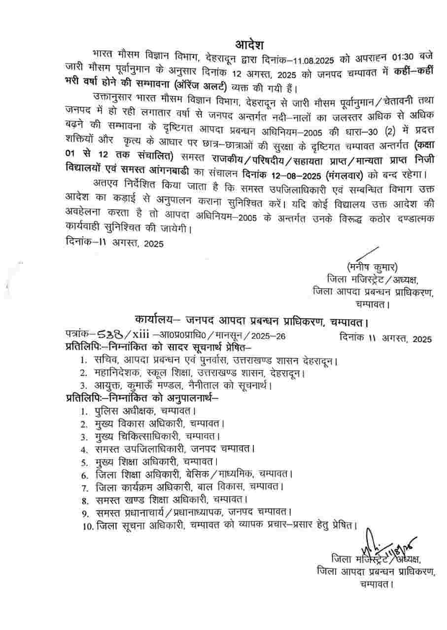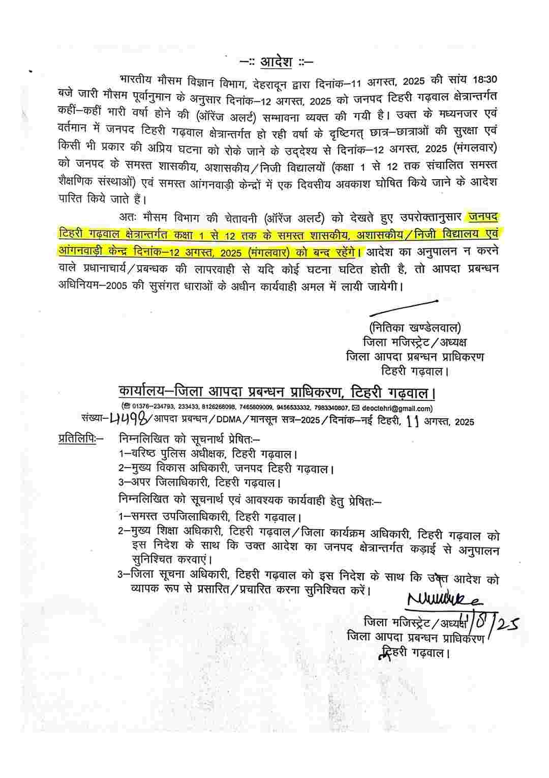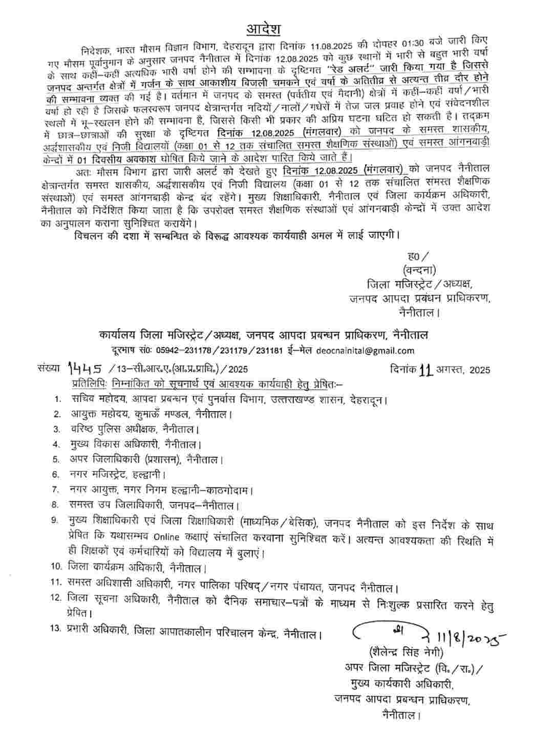जी हां… मंगलवार 12 अगस्त को नैनीताल, देहरादून , चम्पावत, रूद्रप्रयाग, बागेश्वर, टिहरी गढ़वाल, उत्तरकाशी, उधम सिंह नगर और पौड़ी गढ़वाल इन 9 जिलों में 12वीं कक्षा तक के सभी स्कूल एवं आंगनबाड़ी केंद्र बंद रहेंगे।
