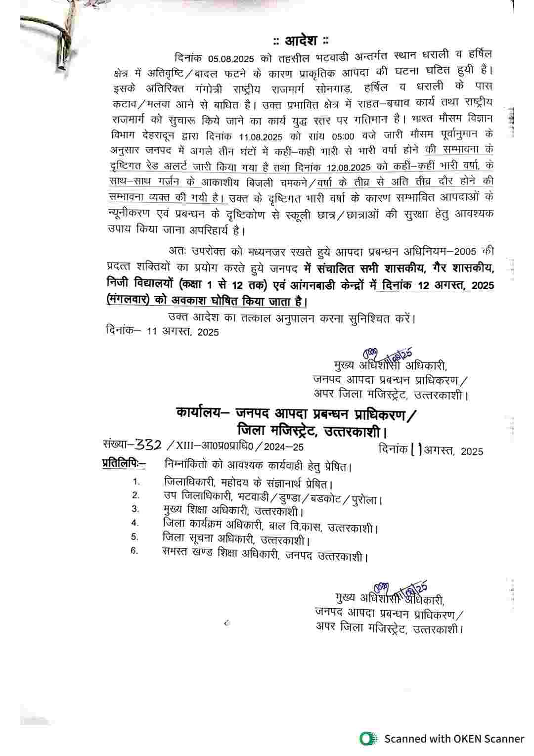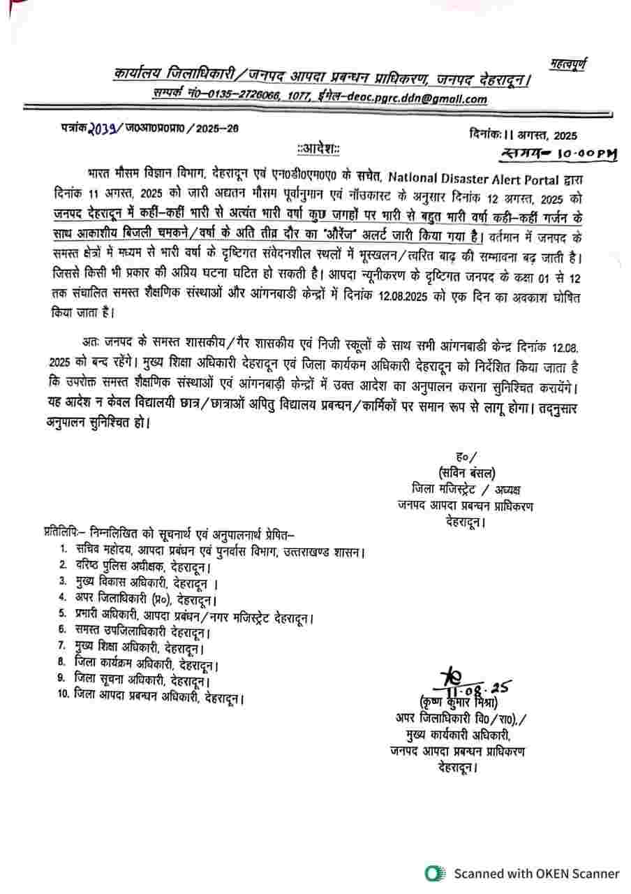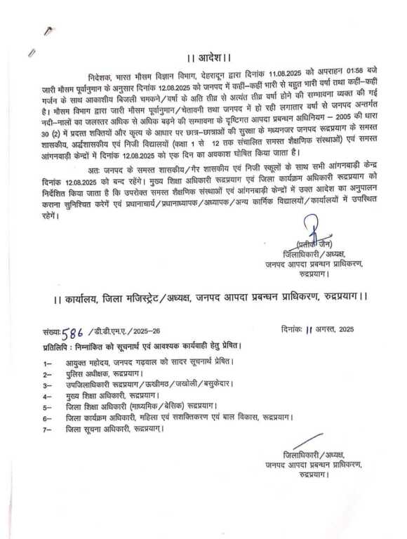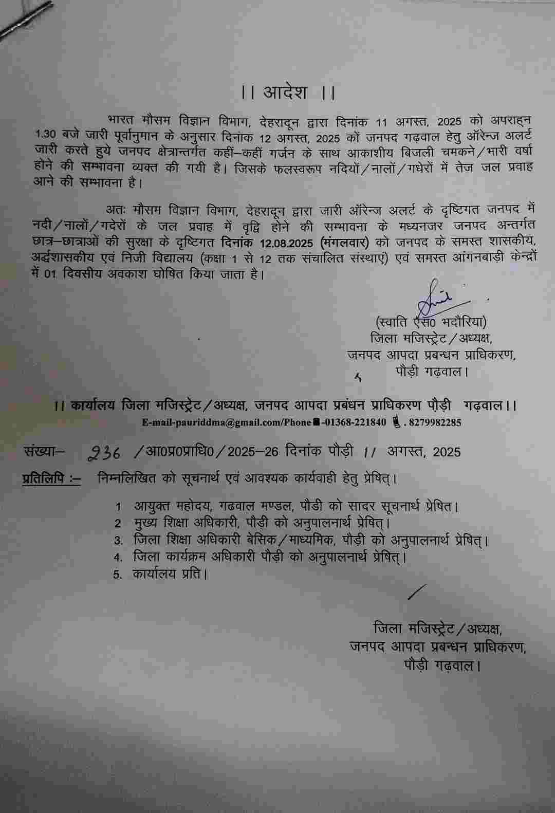जी हां… मंगलवार 12 अगस्त को नैनीताल, देहरादून , चम्पावत, रूद्रप्रयाग, बागेश्वर, टिहरी गढ़वाल, उत्तरकाशी, उधम सिंह नगर और पौड़ी गढ़वाल इन 9 जिलों में 12वीं कक्षा तक के सभी स्कूल एवं आंगनबाड़ी केंद्र बंद रहेंगे।