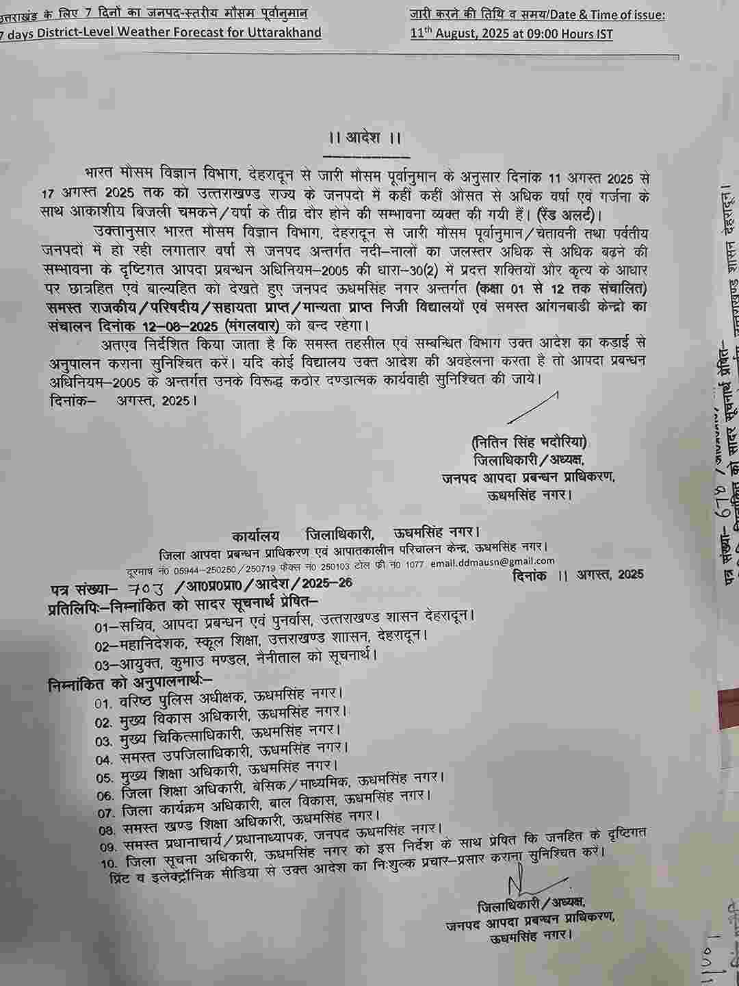 Uttarakhand Heavy rain alert Dehradun Tehri Garhwal Uttarkashi Champawat Udham Singh Nagar Pauri Garhwal Rudraprayag Nainital school closed tomorrow holiday today: मौसम विभाग के पूर्वानुमान को सही साबित करते हुए उत्तराखण्ड के अधिकांश हिस्सों में बीती रात से ही मेघ जमकर बरस रहें हैं। भारी बारिश से जहां नदी नाले उफान पर आने भूस्खलन के कारण सड़क पर मलवा आने से जनजीवन अस्त-व्यस्त हो गया है वहीं शासन प्रशासन भी अलर्ट मोड पर आ गया है। इसी बीच उत्तराखण्ड के स्कूलों एवं आंगनबाड़ी केंद्रों में अवकाश के संबंध में एक बड़ी खबर सामने आ रही है। जिसके मुताबिक नैनीताल, देहरादून , टिहरी गढ़वाल, उत्तरकाशी, चम्पावत, बागेश्वर, ऊधम सिंह नगर , रूद्रप्रयाग और पौड़ी गढ़वाल जिला प्रशासन ने मंगलवार 12 अगस्त को अपने अधीनस्थ जिलों में संचालित समस्त विद्यालयों एवं आंगनबाड़ी केंद्रों में अवकाश घोषित कर दिया है।