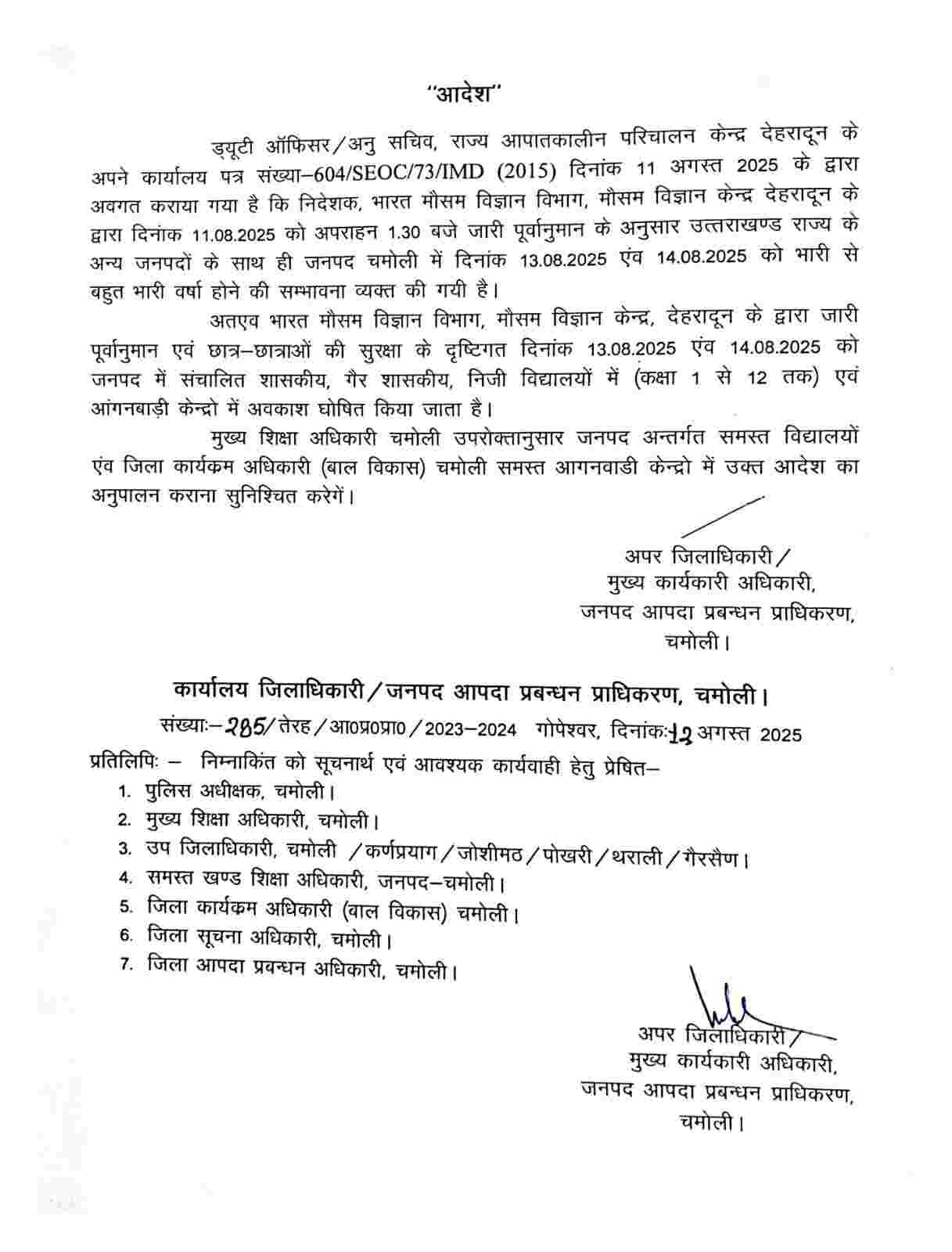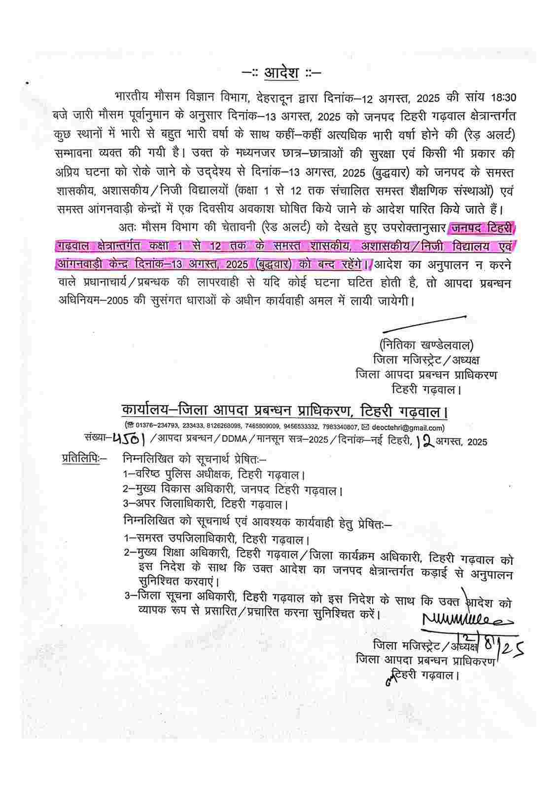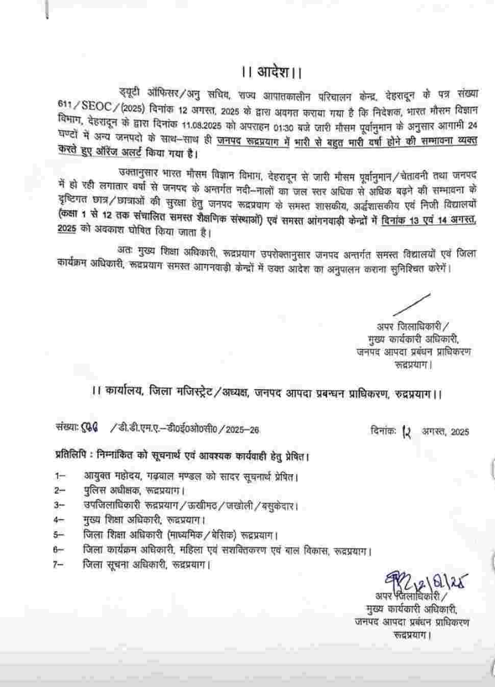 जिसके मुताबिक रूद्रप्रयाग, चमोली और अल्मोड़ा जिला प्रशासन ने बुधवार 13 अगस्त एवं बृहस्पतिवार 14 अगस्त को अपने अधीनस्थ जिलों के सभी स्कूलों एवं आंगनबाड़ी केंद्रों में अवकाश घोषित कर दिया है। जबकि बागेश्वर, पौड़ी गढ़वाल, नैनीताल, उत्तरकाशी, चम्पावत, देहरादून एवं टिहरी गढ़वाल जिले में बुधवार 13 अगस्त को एक दिवसीय अवकाश घोषित किया गया है।