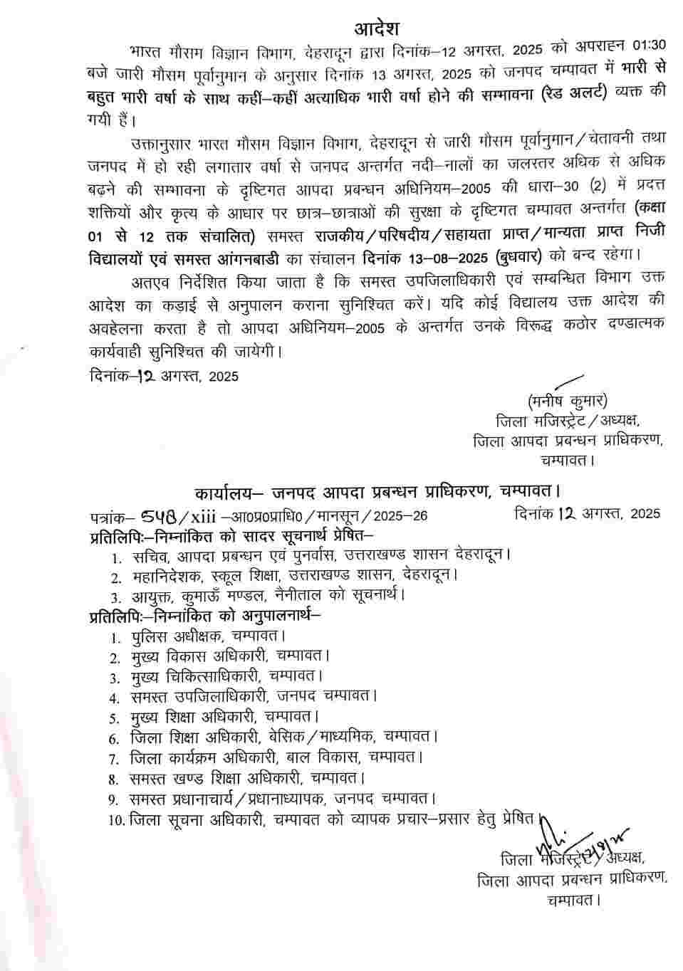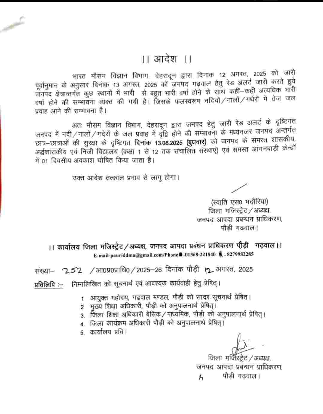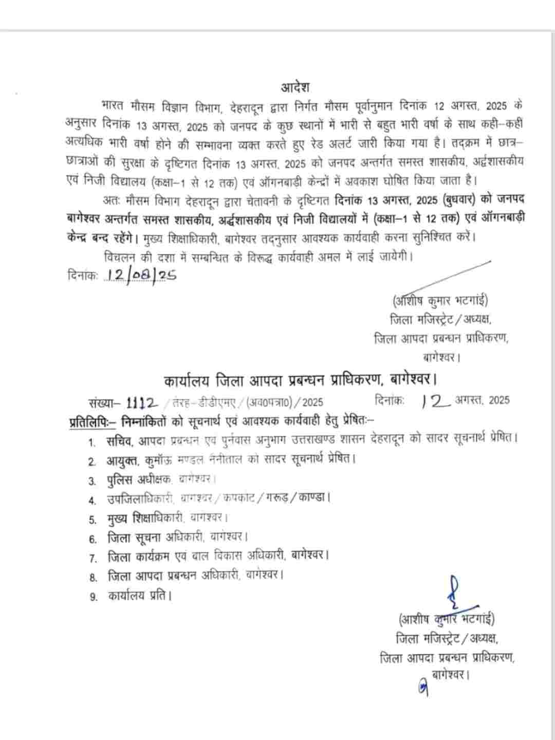 जिसके मुताबिक रूद्रप्रयाग, चमोली और अल्मोड़ा जिला प्रशासन ने बुधवार 13 अगस्त एवं बृहस्पतिवार 14 अगस्त को अपने अधीनस्थ जिलों के सभी स्कूलों एवं आंगनबाड़ी केंद्रों में अवकाश घोषित कर दिया है। जबकि बागेश्वर, पौड़ी गढ़वाल, नैनीताल, उत्तरकाशी, चम्पावत, देहरादून एवं टिहरी गढ़वाल जिले में बुधवार 13 अगस्त को एक दिवसीय अवकाश घोषित किया गया है।