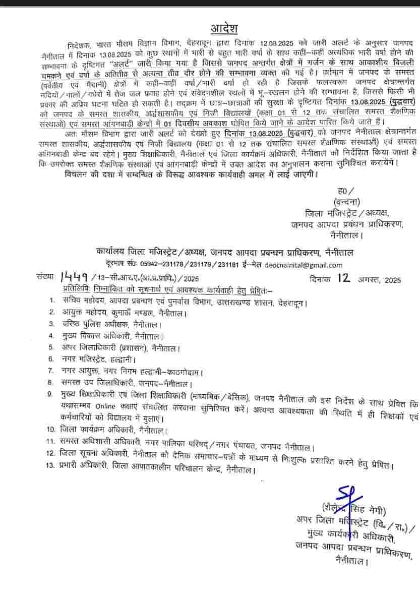 इस संबंध में जिला प्रशासनों द्वारा जारी आदेश में बताया गया है कि मौसम विज्ञान केन्द्र देहरादून के द्वारा जारी ताजा पूर्वानुमान के अनुसार उत्तराखण्ड राज्य में भारी से बहुत भारी वर्षा होने की सम्भावना व्यक्त की गयी है। जिसको मद्देनजर रखते हुए छात्र-छात्राओं की सुरक्षा के दृष्टिगत दिनांक 13.08.2025 एंव 14.08.2025 को अल्मोड़ा, रूद्रप्रयाग एवं चमोली जिलों में संचालित 12वीं कक्षा तक के समस्त शासकीय, गैर शासकीय, निजी विद्यालयों में एवं आंगनबाड़ी केन्द्रो में दो दिवसीय अवकाश तथा बुधवार 13 अगस्त को बागेश्वर, चम्पावत, उत्तरकाशी, नैनीताल, देहरादून, पौड़ी गढ़वाल एवं चमोली जिलों में एक दिवसीय अवकाश घोषित किया जाता है।
