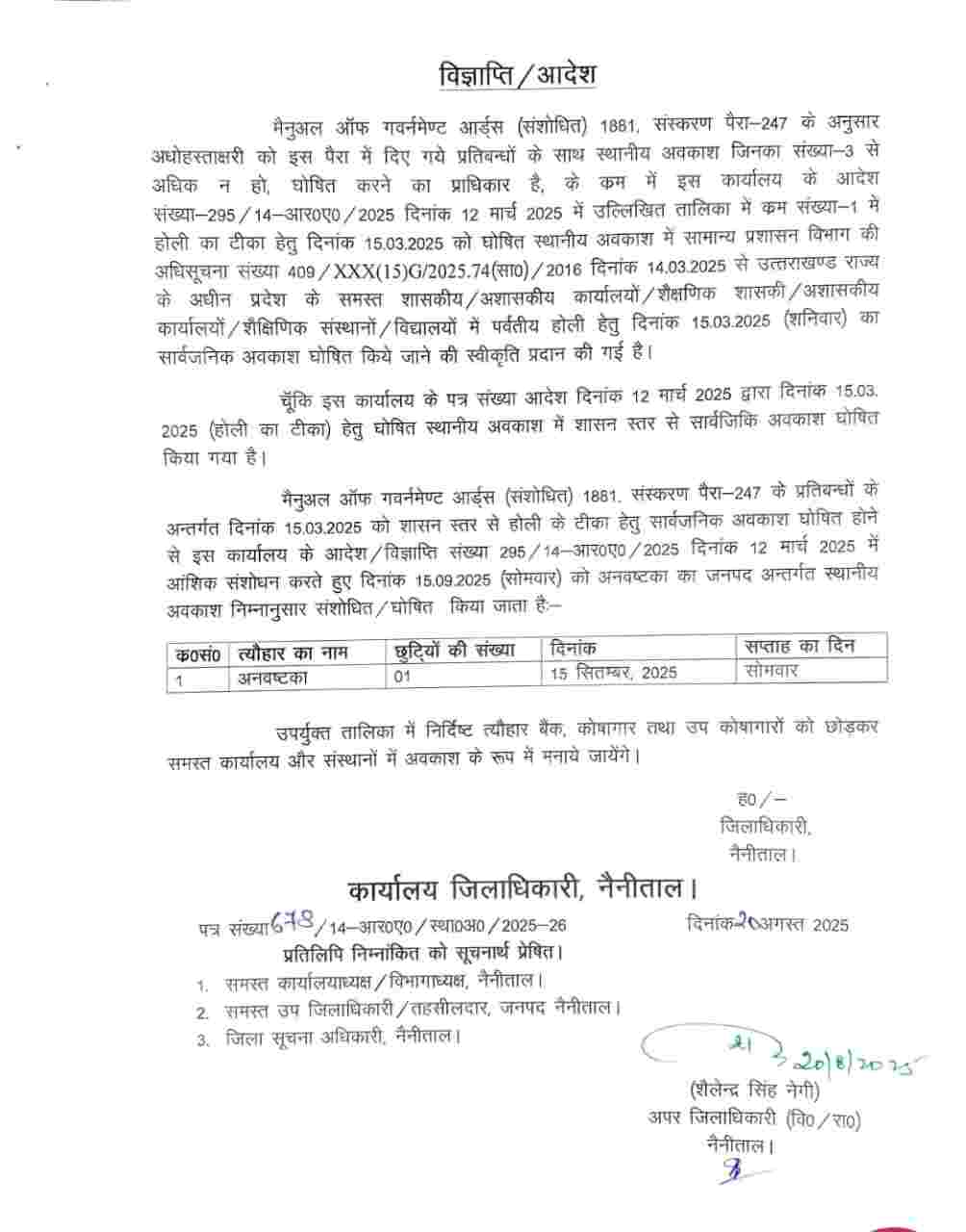 जिलाधिकारी ने पहले घोषित किया था 15 मार्च को होली का अवकाश, उत्तराखण्ड शासन द्वारा सार्वजनिक अवकाश घोषित होने के कारण अब घोषित किया नया स्थानीय अवकाश
