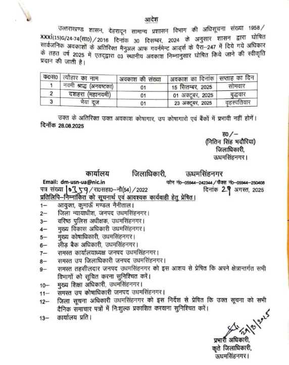 आपको बता दें कि जिलाधिकारी नितिन भदौरिया ने उत्तराखंड शासन द्वारा वर्ष 2025 हेतु घोषित सार्वजनिक अवकाशों के अतिरिक्त मैनुअल आफ गवर्नमेन्ट आर्ट्स के पैरा-247 में दिये गये अधिकार के तहत ये 3 स्थानीय अवकाश घोषित किए हैं। जिलाधिकारी द्वारा 15 सितम्बर को जहां श्राद्ध पक्ष की नवमी तिथि अनवष्टका के अवसर पर अवकाश घोषित किया गया है वहीं 1 अक्टूबर को दशहरा एवं 23 अक्टूबर को भैया दूज पर्व हेतु अवकाश घोषित किया गया है।