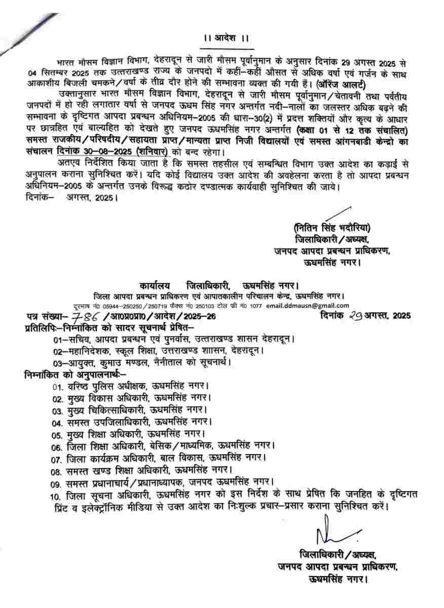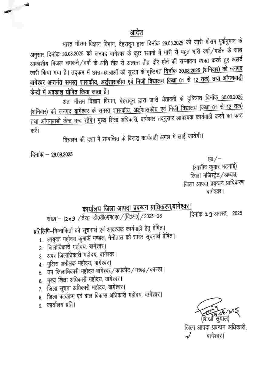 Uttarakhand school closed heavy rain alert holiday Bageshwar Rudraprayag Uttarkashi udham Singh Nagar district today tomorrow news: मौसम विभाग द्वारा जारी अलर्ट को देखते हुए जिला प्रशासन ने जारी किया आदेश, शनिवार 30 अगस्त को रूद्रप्रयाग, बागेश्वर ऊधम सिंह नगर और उत्तरकाशी जिलों में बंद रहेंगे सभी स्कूल आंगनबाड़ी केंद्र….