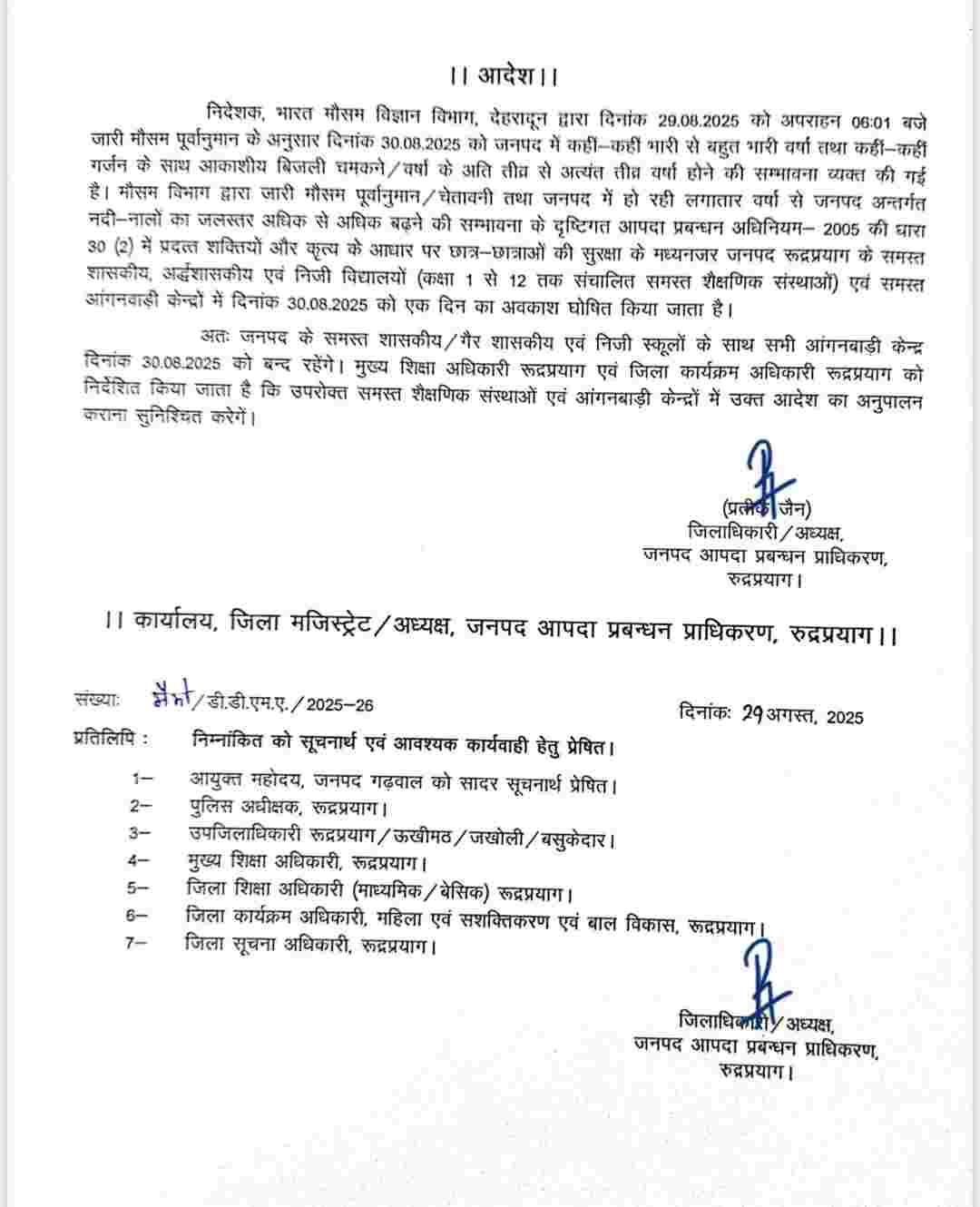 इस संबंध में जिला प्रशासनों द्वारा जारी आदेश में बताया गया है किभारत मौसम विज्ञान विभाग, देहरादून से जारी मौसम विभाग द्वारा दिनांक 29 अगस्त 2025 से 04 सितम्बर 2025 तक उत्तराखण्ड राज्य के जनपदो में कहीं-कहीं भारी बारिश एवं गर्जन के साथ आकाशीय बिजली चमकने/वर्षा के तीव्र दौर होने की सम्भावना व्यक्त की गयी हैं। (ऑरेंज आलर्ट) जिसको मद्देनजर रखते हुए छात्र-छात्राओं के सुरक्षा के दृष्टिगत अधीनस्थ जनपदों में संचालित सभी स्कूलों एवं आंगनबाड़ी केंद्रों में शनिवार 30 अगस्त को अवकाश घोषित किया जाता है। यह भी पढ़ें- Uttarakhand weather: 2 सितंबर तक जमकर बरसेंगे मेघ भारी बारिश का रेड आरेंज अलर्ट