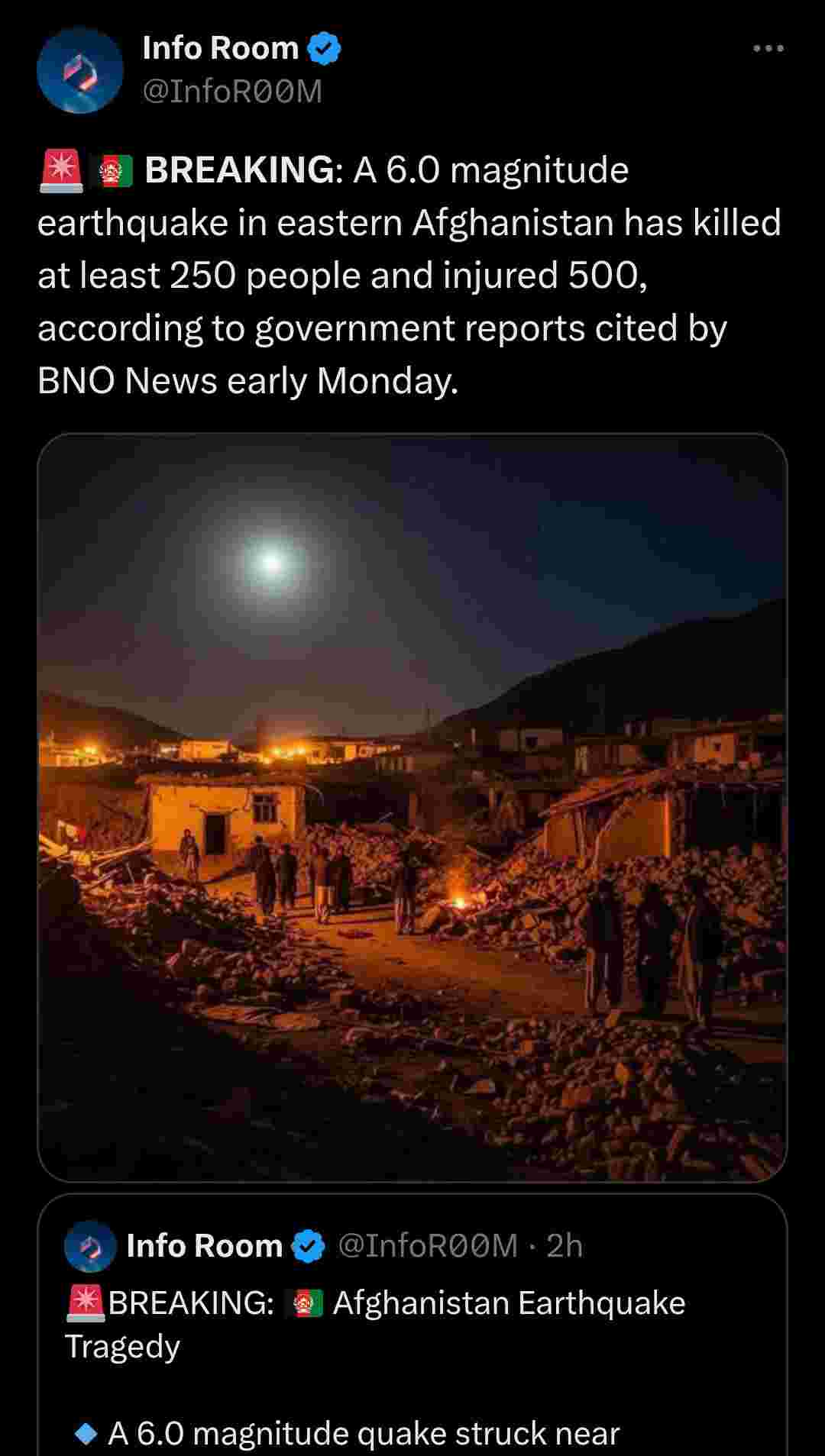 इस संबंध में अमेरिकी भूवैज्ञानिक सर्वेक्षण (USGS) के अनुसार भूकंप जलालाबाद से 27 किलोमीटर पूर्व-उत्तर-पूर्व में 8 किलोमीटर की गहराई पर आया। हिंदुकुश पर्वतीय क्षेत्र में शामिल कुनार प्रांत के नूर गल, सावकी, वातपुर, मनोगी और चापा दारा जिलों में भूंकप ने भीषण तबाही मचाई है। कई इमारतें जमींदोज हो गई है। शासन प्रशासन ने रेस्क्यू ऑपरेशन शुरू कर दिया है। गहरी नींद में सोए लोग भी इसके मलबे में दफन हो गए हैं। आपको बता दें कि भूकंप के लिहाज से अति संवेदनशील अफगानिस्तान में अक्टूबर, 2023 में भी 6.3 तीव्रता का भूकंप आया था। इस दौरान भूकंप में कम से कम 4,000 लोग मारे गए थे।
