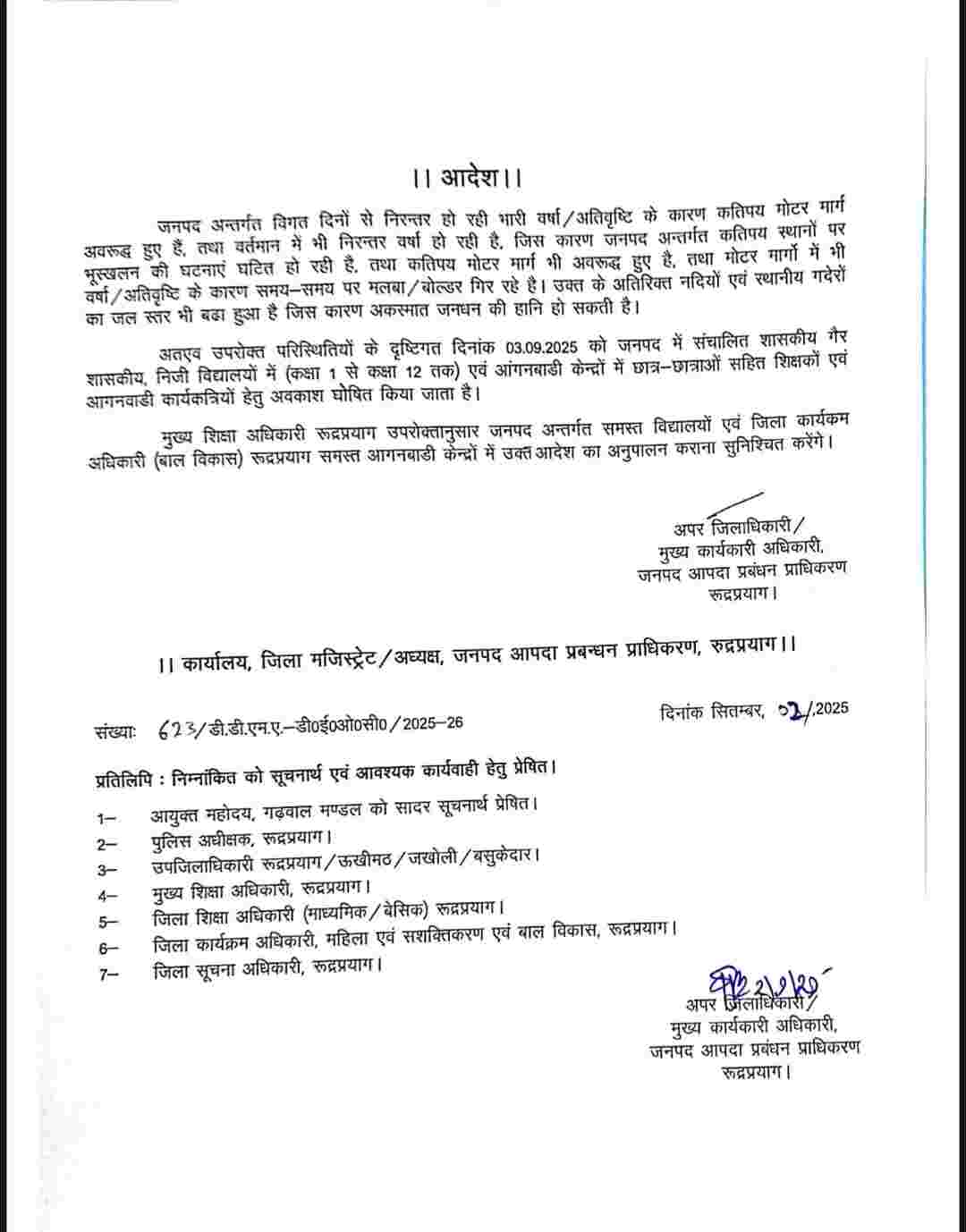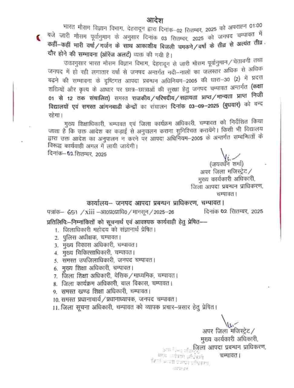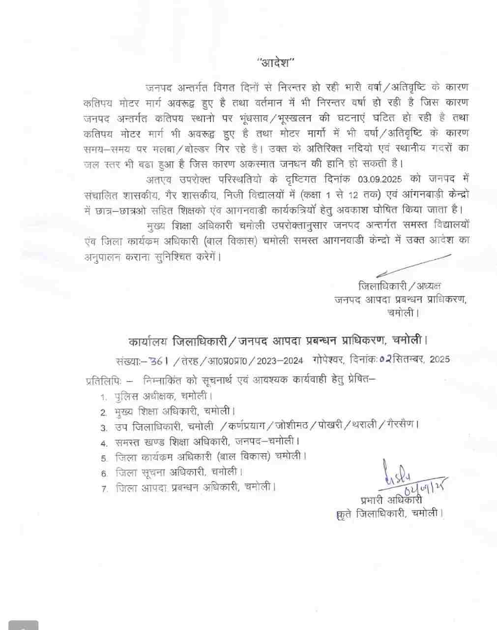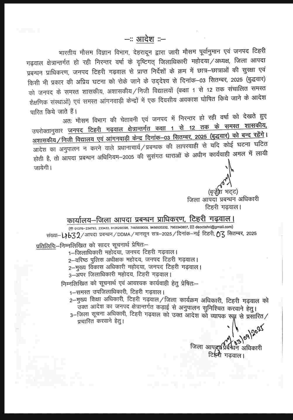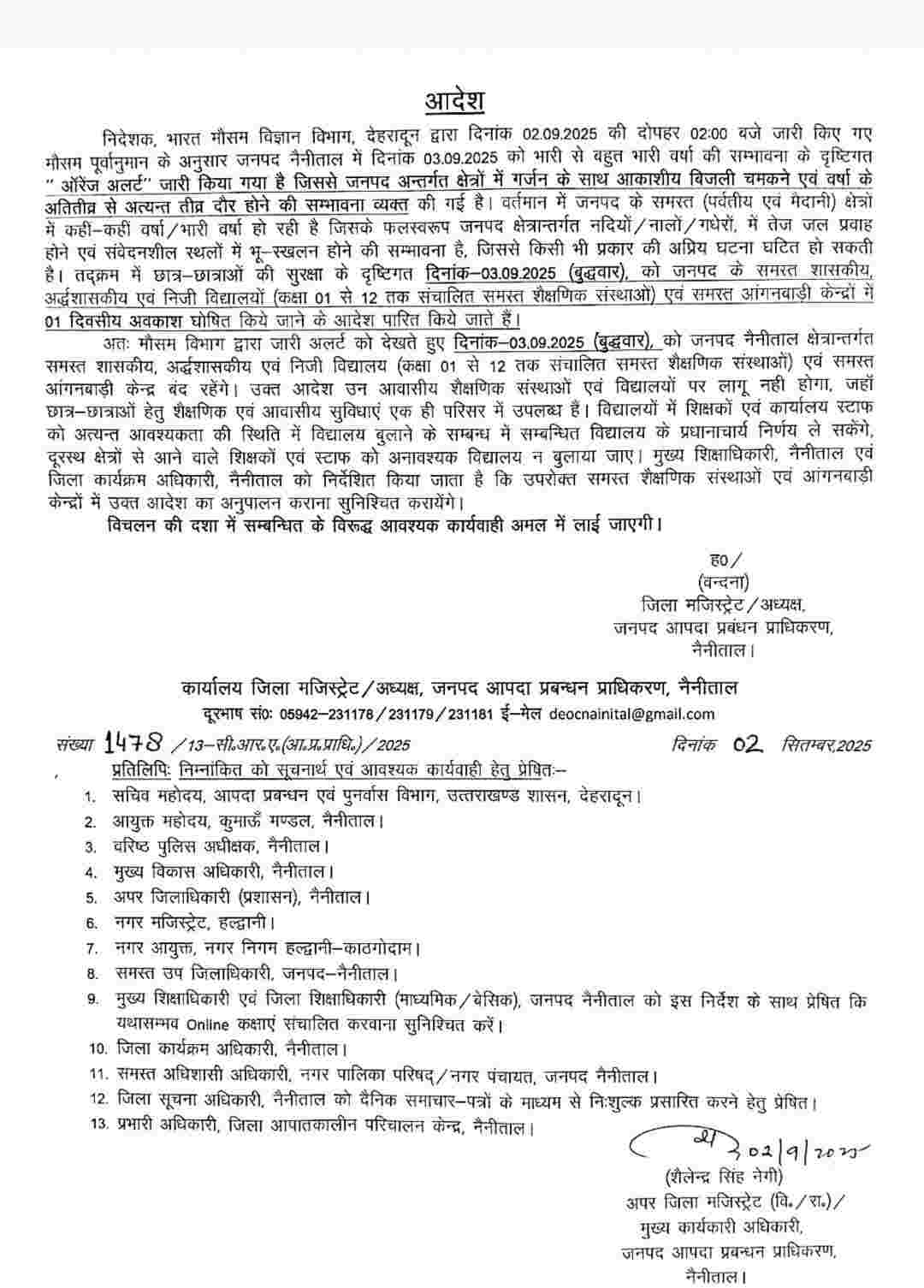 इस संबंध में जिला प्रशासन द्वारा जारी आदेश में कहा गया है कि मौसम विभाग के पूर्वानुमान में जनपद सहित राज्य के कई जिलों में भारी बारिश, आकाशीय बिजली चमकने का आरेंज अलर्ट जारी किया गया है। जिसको मद्देनजर रखते हुए छात्र-छात्राओं के सुरक्षा के दृष्टिगत जनपद चम्पावत, टिहरी गढ़वाल, नैनीताल रूद्रप्रयाग, उत्तरकाशी और चमोली में संचालित 12वीं कक्षा तक के सभी सरकारी अर्धसरकारी एवं निजी विद्यालयों एवं आंगनबाड़ी केंद्रों में बुधवार 3 सितंबर को एक दिवसीय अवकाश घोषित किया जाता है। यह भी पढ़ें- Uttarakhand snowfall: सितंबर की शुरुआत में ही बर्फबारी, चोटियों में सीजन का पहला हिमपात