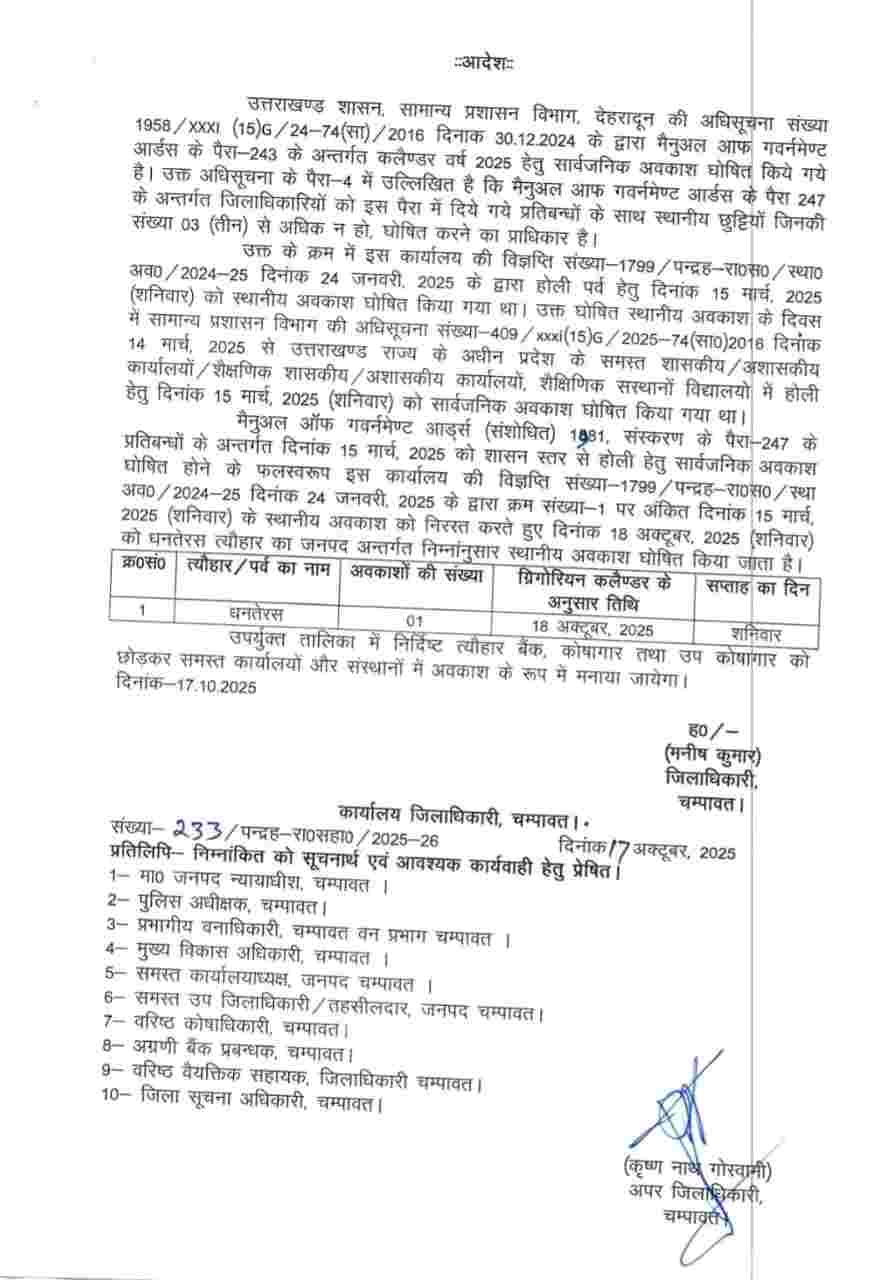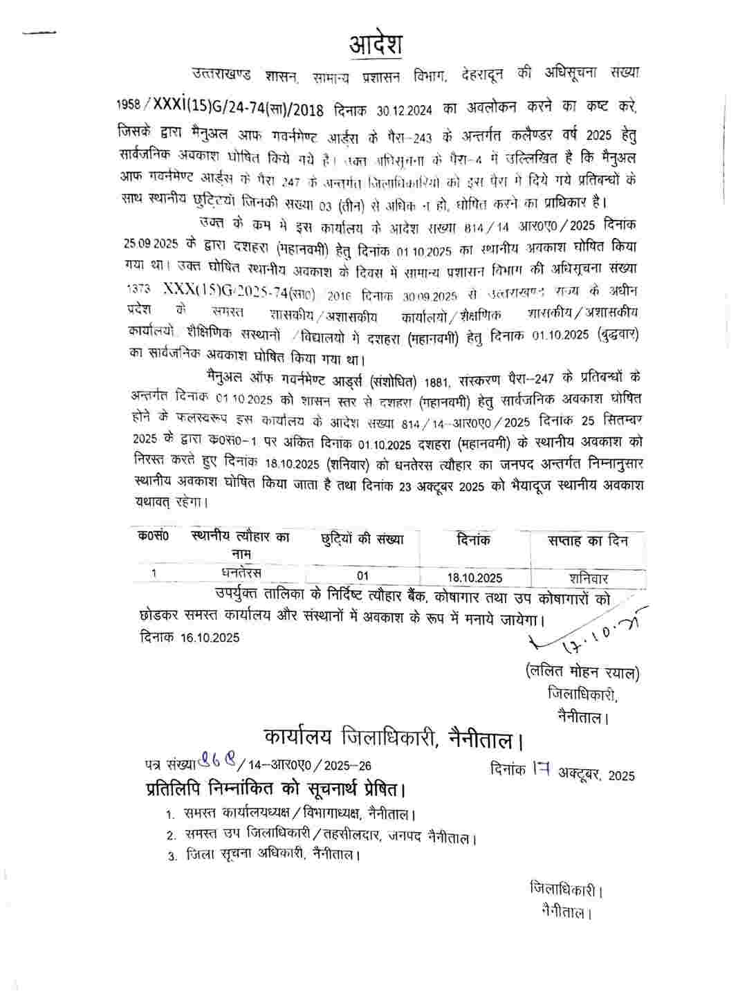 nainital champawat school office closed due to dhanteras holiday tomorrow 18 October uttarakhand breaking news today: नैनीताल और चम्पावत जिलाधिकारियों ने स्थानीय अवकाश का संशोधित आदेश किया जारी, अब शनिवार को धनतेरस के दिन रहेगी छुट्टी…