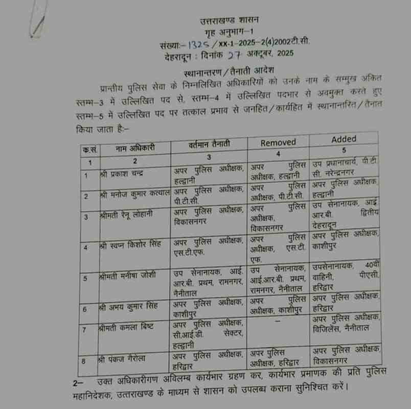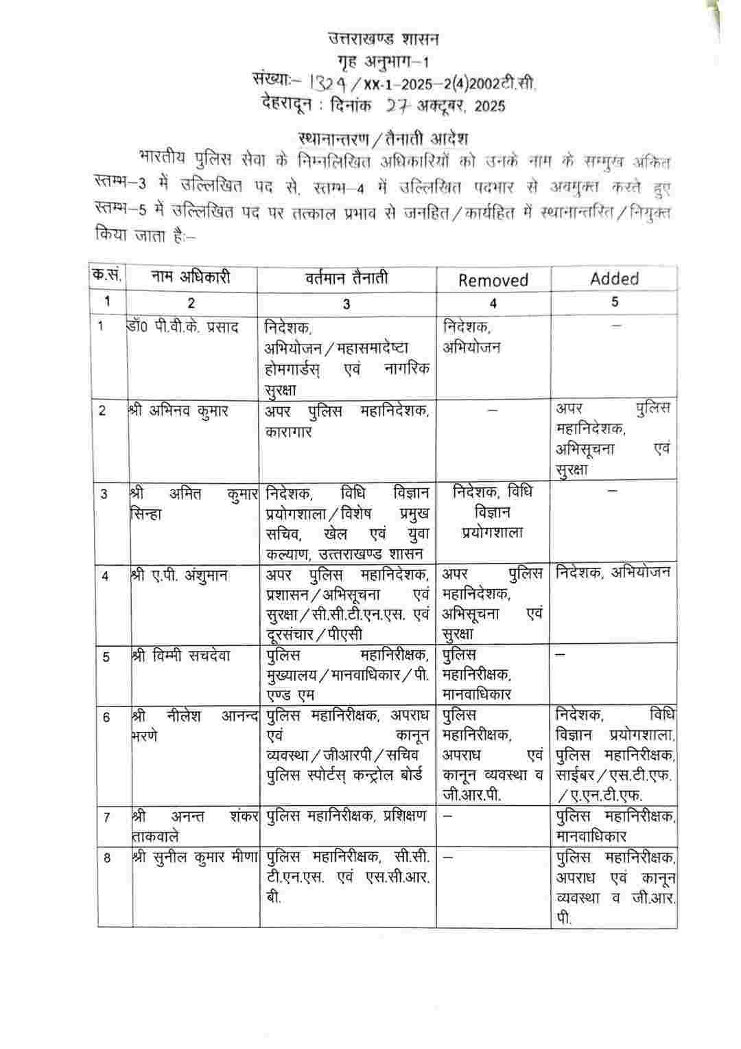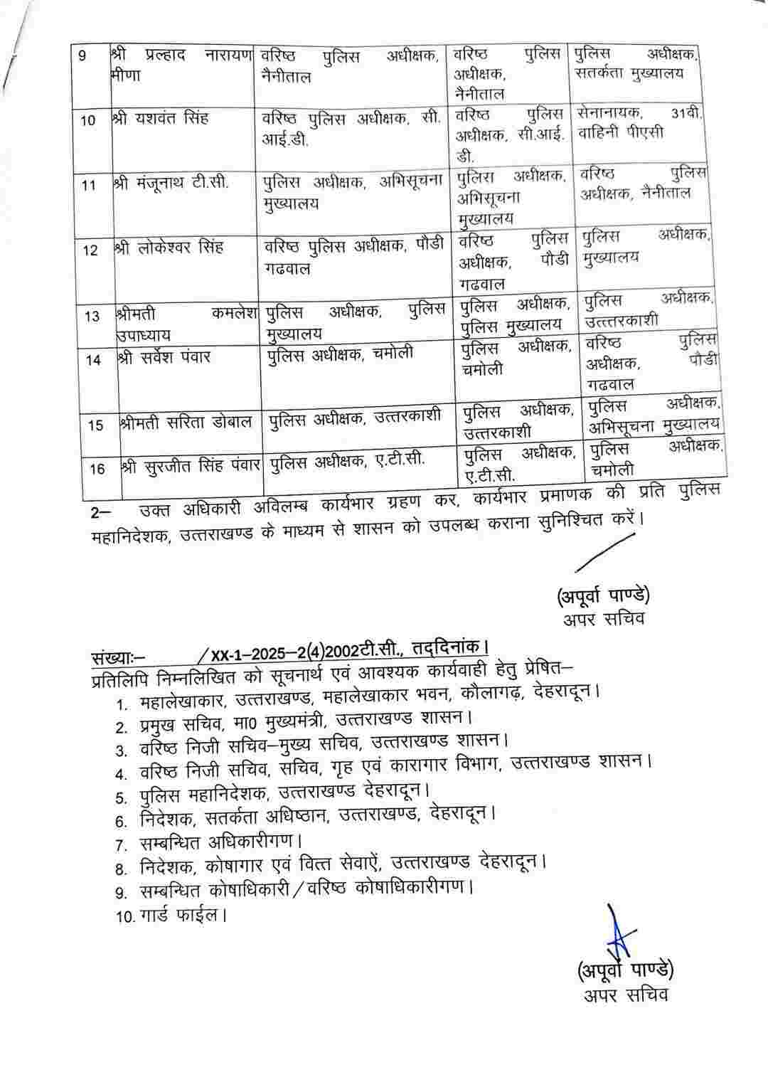 Uttarakhand 16 IPS 8 PPS officer transfer 4 SSP SP also change chamoli nainital Pauri Garhwal Uttarkashi district uttarakhand breaking news today: सोमवार देर शाम जारी हुए आदेश, 4 पर्वतीय जनपदों के पुलिस कप्तान भी बदले….
