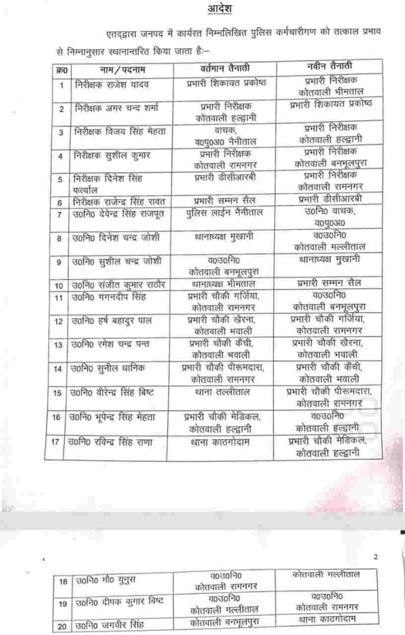 इंस्पेक्टर स्तर पर हुए प्रमुख बदलाव nainital inspector transfer today