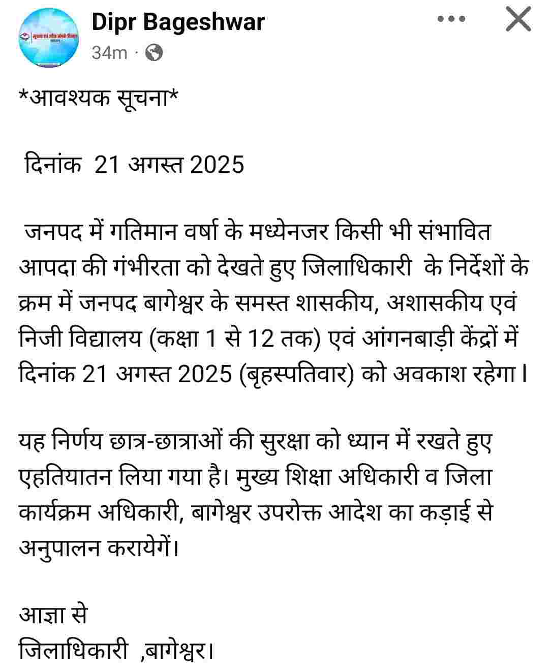 Bageshwar school closed today: बागेश्वर में आज 21 अगस्त को बंद रहेंगे सभी स्कूल