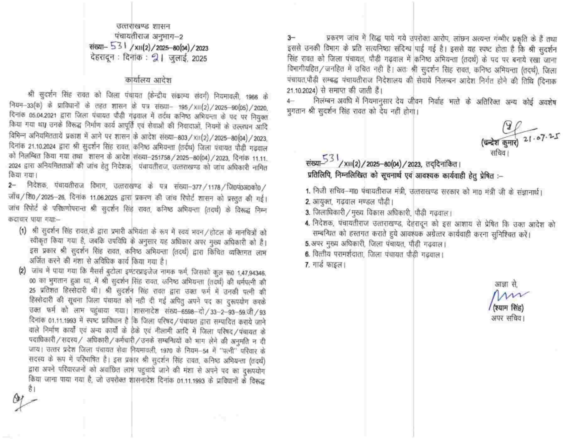 अभी तक मिली जानकारी के अनुसार पंचायती राज सचिव चंद्रेश कुमार ने आदेश जारी करते हुए कहा की सुदर्शन सिंह रावत को जिला पंचायत पौड़ी में 5 अप्रैल 2021 को कनिष्ठ अभियंता के पद पर नियुक्त किया गया था जिनके खिलाफ निर्माण कार्य की आपूर्ति एवं सेवाओं की निविदाओ संबंधी अनियमिताएं सामने आने पर पिछले वर्ष 21 अक्टूबर को उन्हें निलंबित कर दिया गया था। वही सुदर्शन ने प्रभारी अभियंता के रूप में भवन और होटल के मानचित्रो को खुद स्वीकृत किया ,जबकि यह अधिकार अपर मुख्य अधिकारी को है जिसके तहत व्यक्तिगत लाभ के लिए उन्होंने गैर कानूनी काम किया।